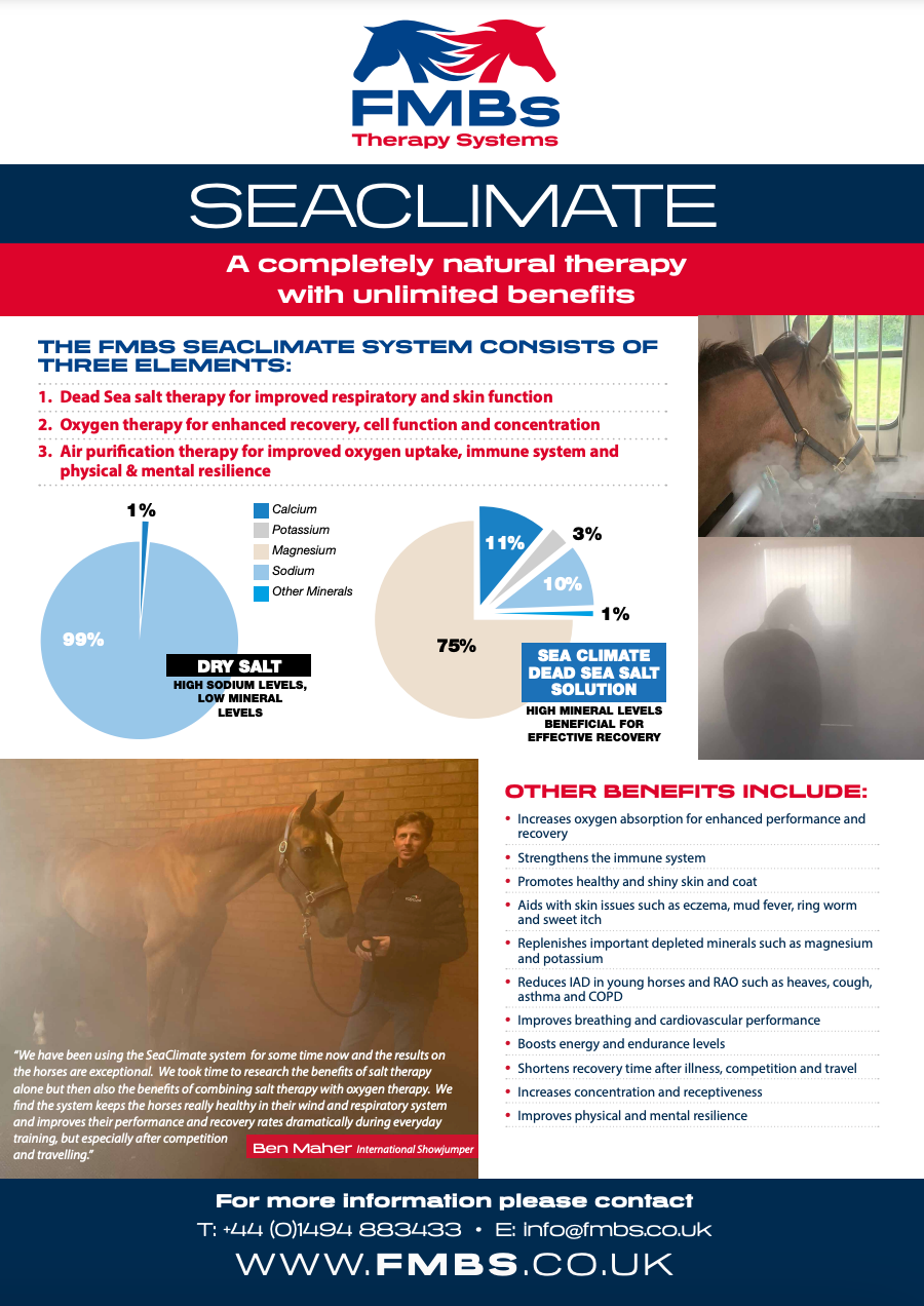 Our SeaClimate systems combine holistic and scientific approaches in treating equine athletes. We nebulise medically approved Dead Sea salt solution enriched with magnesium and other minerals, which is vaporised with de-ionised air at specific rates into the atmosphere within our enclosed bespoke stable.The process involves controlled release and inhalation of a complex mix of mineral salts from the Dead Sea, through our equines respiratory system and skin cells simultaneously.